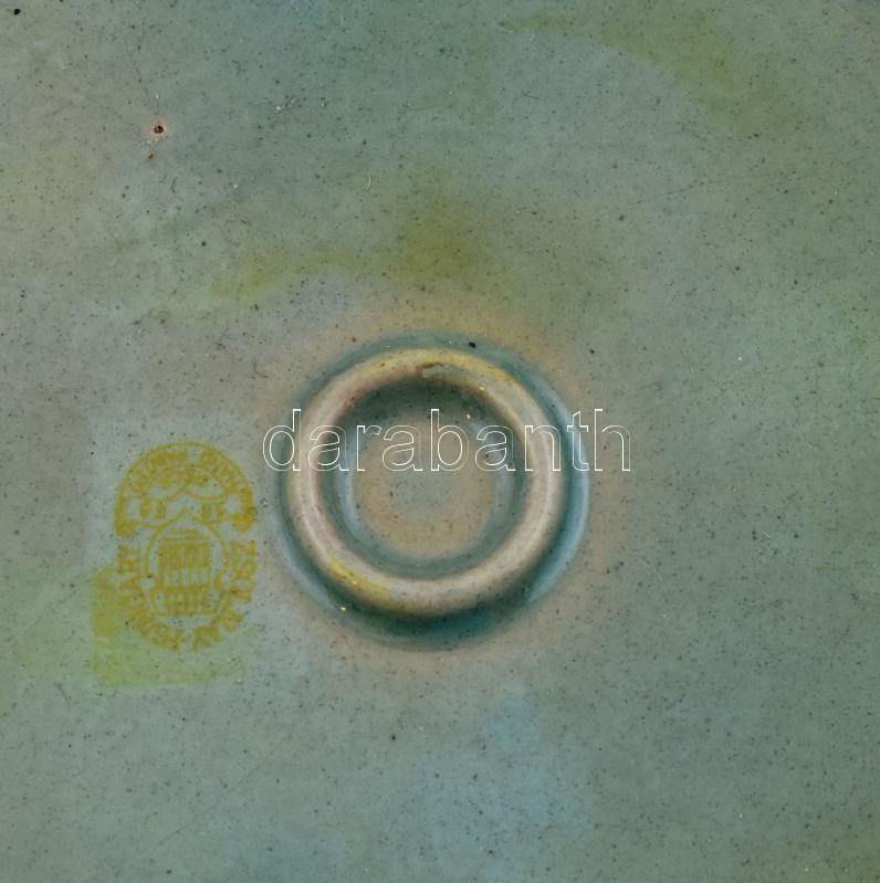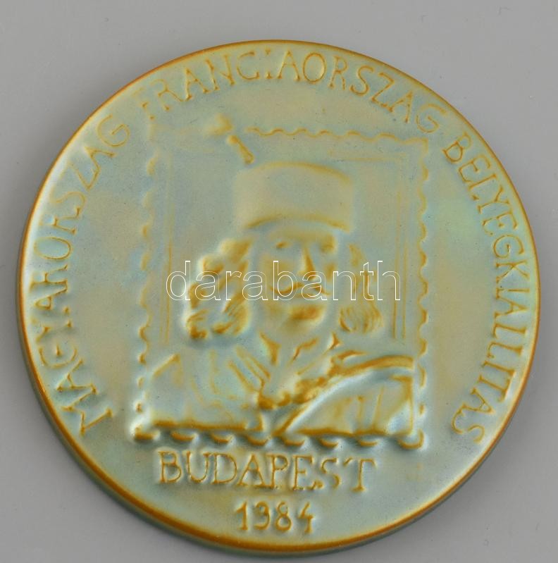 Zsolnay eozin plakett, Magyarország Franciaorzság bélyegkiállítás Budapest 1984 felirattal, II. Rákóczi Ferenc mellképével, apró kopásnyomokkal, hátoldalán égetési hibákkal (foltokkal), d: 11 cm