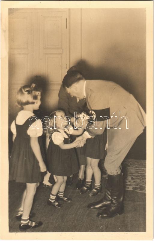 Adolf Hitler with little girls. Photo-Hoffmann 727. https://www.darabanth.com/de/395-Fernauktion/395.0/Ansichtskarten/Herrscher-Politiker-Konigshauser~1000093/Adolf-Hitler-with-little-girls-Photo-Hoffmann-727~II2400787