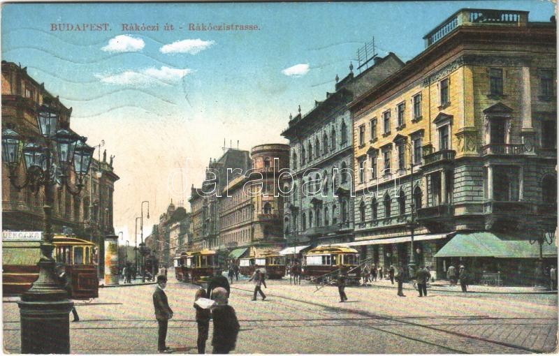 Beschreibung: 1914 Budapest VII. Rákóczi út, villamosok, Emke kávéház