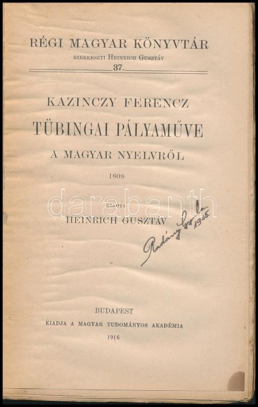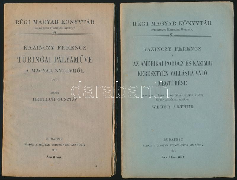 Régi Magyar Könyvtár 2 kötete (34.,37.), benne Kazinczy Ferenc 2 munkájával: Kazinczy Ferenc: Az amerikai Podocz és Kazmir keresztyén vallásra való megtérése. Bessenyei német eredetijével együtt kiadta és bevezetéssel ellátta Weber Arthur. Régi Magyar Könyvtár 34. Bp., 1914., MTA, 58 p. Kiadói papírkötés.; + Kazinczy Ferenc tübingai pályaműve a magyar nyelvről. 1808. Kiadta: Heinrich Gusztáv. Régi Magyar Könyvtár 37. Bp., 1916., MTA, 194 p. Kiadói papírkötés, foltos, hullámos lapokkal.
