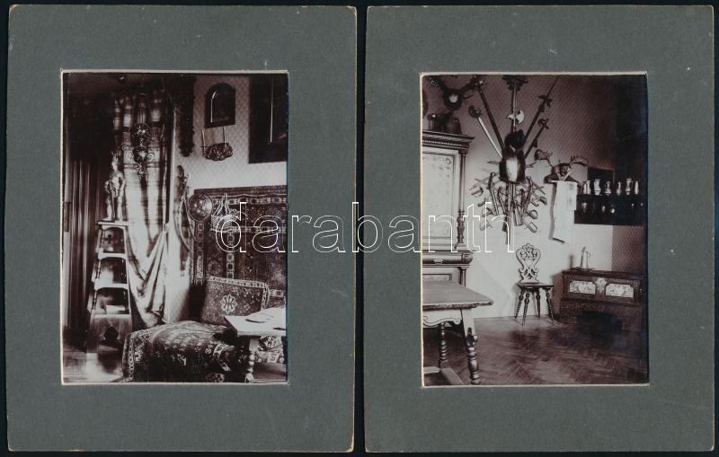 Beschreibung: 1902 Budai várbeli szobarészlet, 2 db fotó, papírtokban, hátoldalon feliratozva, 11×8 cm
