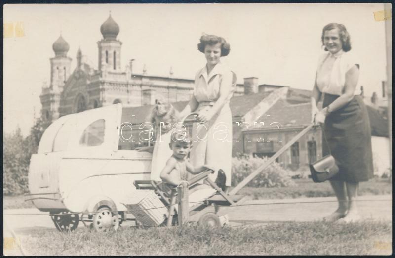 Beschreibung: 1954 Debrecen, Petőfi tér, a háttérben az egykori Deák Ferenc utcai zsinagóga a leégése után, tető és kupola nélkül, ragasztónyomokkal, 14x9 cm
