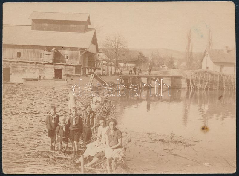 cca 1905 Dicsőszentmárton (Erdély), árvíz, gyerekek mennek iskolába a fűzfákkal megerősített gáton, hátoldalon feliratozott fotó dr. Zsakó István orvos, idegsebész hagyatékából, 8×11 cm