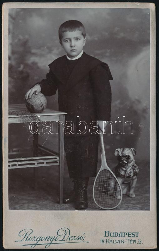 cca 1910 Kisfiú labdával, teniszütővel és kutyaszoborral, keményhátú f... https://www.darabanth.com/de/395-Fernauktion/395.0/Fotografie/Foto~500021/cca-1910-Kisfiu-labdaval-teniszutovel-es-kutyaszoborral-kemenyhatu-foto-Rozgonyi-Dezso-b~II2403113