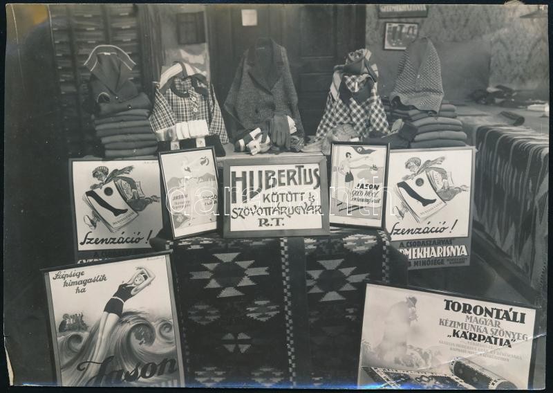 cca 1930 Békéscsaba, Hubertus kötött és Szövöttárugyár, áruminták, hátoldalon feliratozott fotó, sarkán törésnyom, másikon egy réteg papír leszakítva a hátoldalon, 11,5×16,5 cm