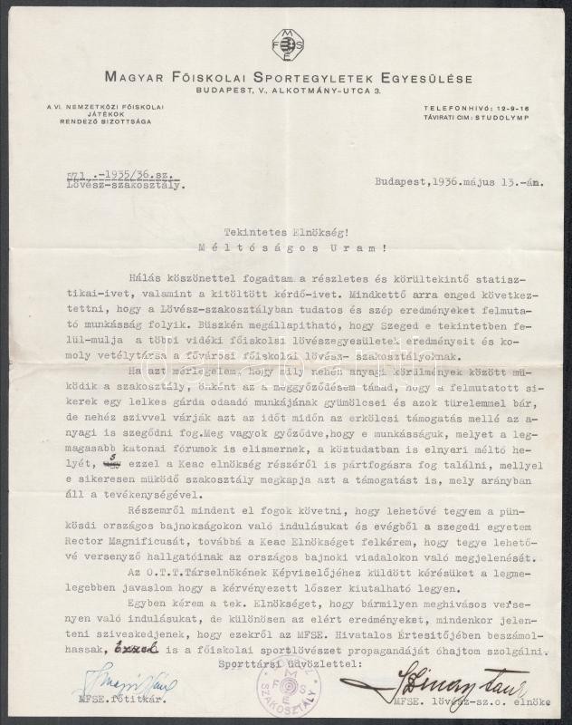 Beschreibung: 1936 Bp., Magyar Főiskolai Sportegyletek Egyesülése fejléces levele aláírásokkal