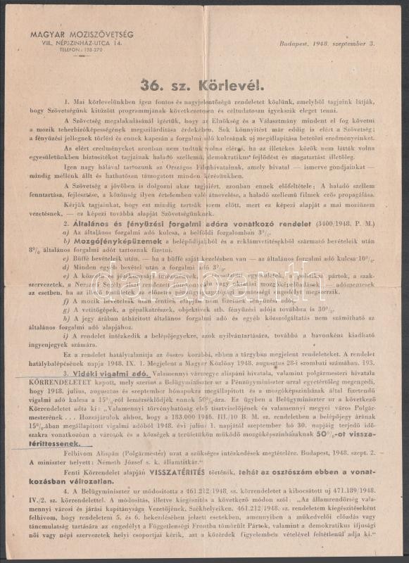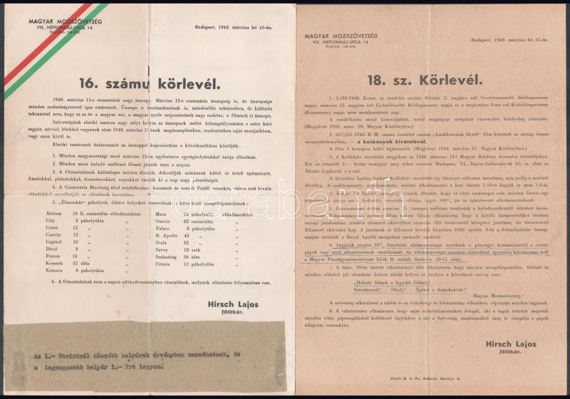 1948 Magyar Moziszövetség 16., 18., 29. és 30. sz. körlevele, hajtásny... https://www.darabanth.com/de/395-Fernauktion/395.0/Kunst-Dokumente-andere-Sammelgebiete/Drucksachen~500031/1948-Magyar-Moziszovetseg-16-18-29-es-30-sz-korlevele-hajtasnyomokkal-nehany-tollas-~II2396903