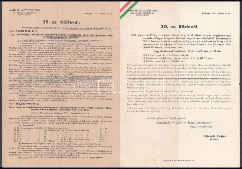 Beschreibung: 1948 Magyar Moziszövetség 16., 18., 29. és 30. sz. körlevele, hajtásnyomokkal, néhány tollas aláhúzással
