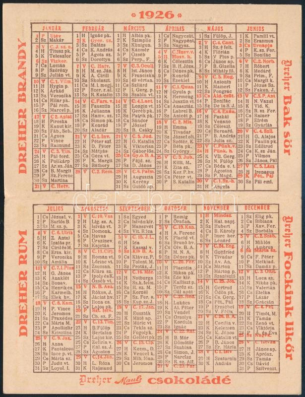 1926 Dreher kinyitható kártyanaptár https://www.darabanth.com/de/395-Fernauktion/395.0/Kunst-Dokumente-andere-Sammelgebiete/Werbungen~500022/1926-Dreher-kinyithato-kartyanaptar~II2396792