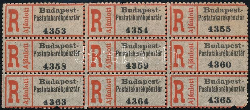 Beschreibung: Budapest-Postatakarékpénztár ajánlási ragjegy 9 db-os ívdarabban