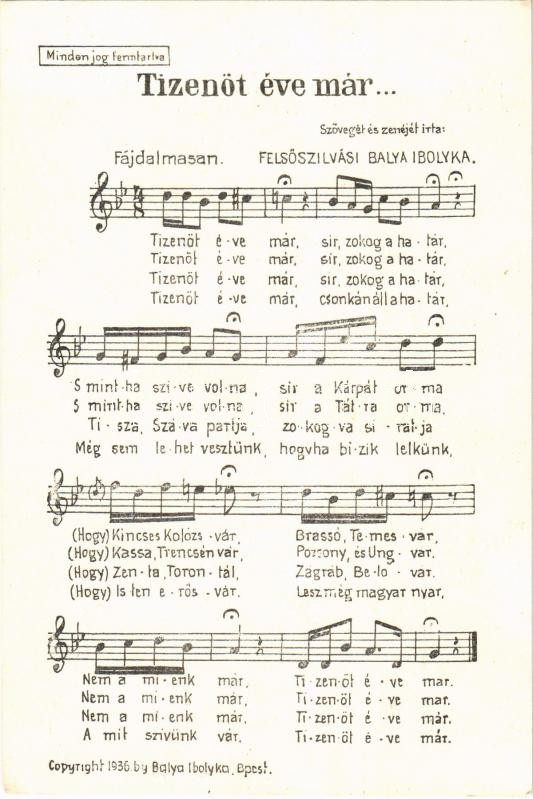 Tizenöt éve már, sír, zokog a határ... Szövegét és zenéjét írta: Felső... https://www.darabanth.com/de/396-Fernauktion/396.0/Ansichtskarten/Irredenta~1500075/Tizenot-eve-mar-sir-zokog-a-hatar-Szoveget-es-zenejet-irta-Felsoszilvasi-Balya-Ib~II2404266