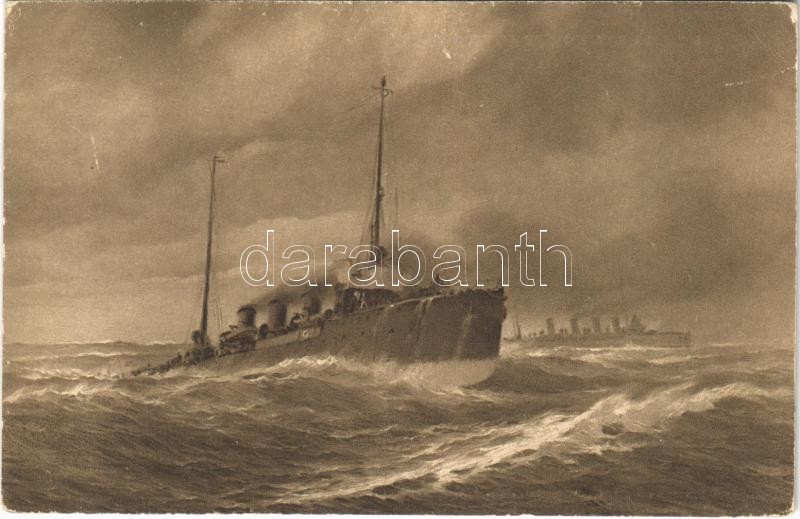 Aufklärungsfahrt gegen Pelagosa durch SMS Helgoland und Zeströrer am 28. Juli 1915. SM Kriegsmarine im Weltkriege / WWI Austro-Hungarian Navy art postcard, K.u.K. Kriegsmarine, SMS Helgoland light cruiser and a destroyer on a reconnaissance mission against Pelagosa. Verlag F.W. Schrinner, Pola s: Ramberg (EK)