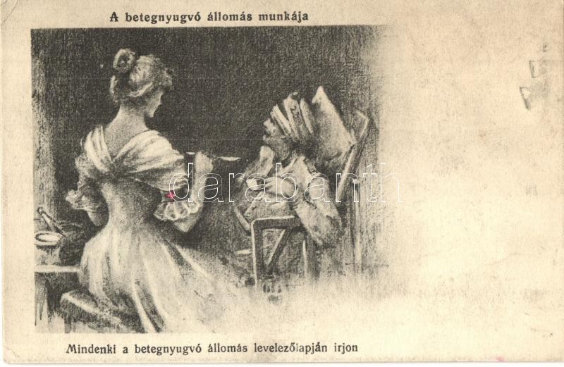 'A betegnyugvó állomás munkája, Mindenki a betegnyugvó állomás levelezőlapján írjon', Vöröskereszt Egylet pecsételéssel, katonai kórház, I. világháború / Hungarian military hospital, Red Cross nurse, WWI, 'Vörös-Kereszt Egylet Betegnyugvó Állomása' So. Stpl. (EK)