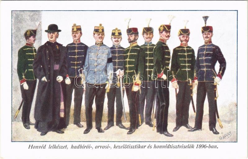 Honvéd lelkészet, hadbírói-, orvosi-, kezelőtisztikar és honvédtisztviselők 1896-ban. Honvédség története 1868-1918 / Austro-Hungarian K.u.K. military art postcard s: Garay