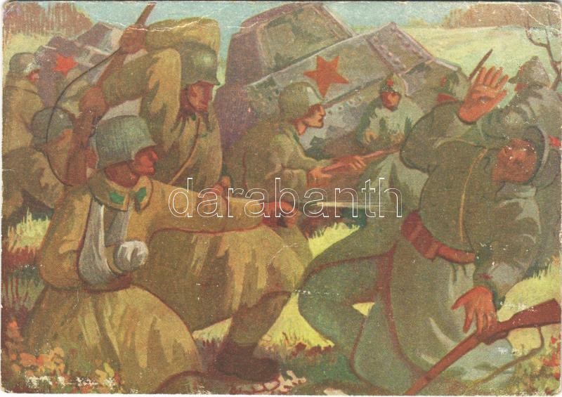 Beschreibung: Karsai István hadnagy sebesülten vezetett megsemmisítő rohamot egy ellenséges támpont ellen / WWII Hungarian military art postcard (EK)
