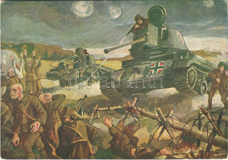 Resch Rudolf alezredes, harckocsi-ezredparancsnok, vakmerő rajtaütéssel betört a szovjet védőövezetbe és több ellenséges kísérődön kívül hat szovjet péncéltörő ágyút lőtt ki / WWII Hungarian military art postcard