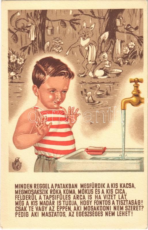Beschreibung: Minden reggel a patakban megfürdik... Egészségügyi Minisztérium kiadása. Képzőművészeti Alap Kiadóvállalat / Hungarian health propaganda