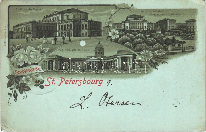 1898 (Vorläufer) Saint Petersburg, St. Petersbourg; Theatre de Marie, Cathédrale de Kazan, Theatre d'Alexandre, Monument Catherina / theatres, cathedral, statue. Louis Glaser Art Nouveau, floral, litho (EK)