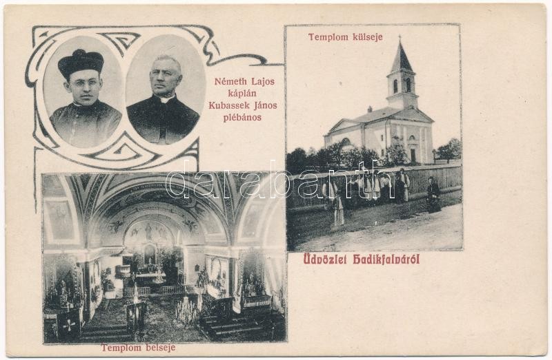 Dornesti, Hadikfalva (Bukovina, Bukowina); Templom külseje és belseje, Németh Lajos káplán, Kubassek János plébános. Scurei és Prager kiadása / church, interior, the chaplain and the parish priest (EK)