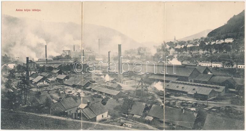 Anina, Stájerlakanina, Stájerlak, Steierdorf; vasgyár teljes látképe. Három részes kihajtható panorámalap, Hubert Zsigmond kiadása / iron works, factory. 3-tiled folding panoramacard (hajtásnál szakadt / bent til broken)