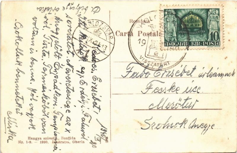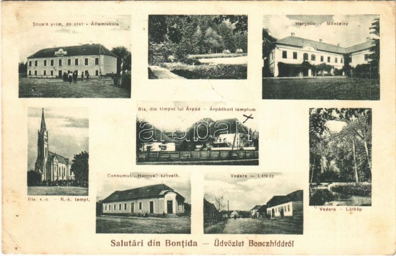 Beschreibung: Bonchida, Bontida; Méntelep, Árpád-kori templom, Hangya szövetkezet üzlete, római katolikus templom / stud farm, churches, shop + "1940 Kolozsvár visszatért" So. Stpl (EK)