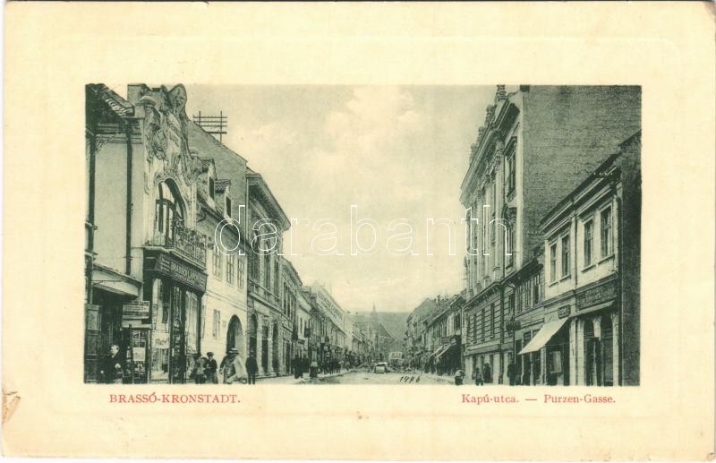 Beschreibung: Brassó, Kronstadt, Brasov; Kapu utca, Brassói Lapok, Szegedy L. üzlete, Bodendorf cukrászdája. W. L. Bp. 6844. / Purzen-Gasse / street view, shops, confectionery (kis szakadás / small tear)
