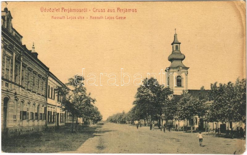Beschreibung: Perjámos, Periam; Kossuth Lajos utca, templom. W. L. 1627. / Kossuth Lajos Gasse / street view, church (EM)