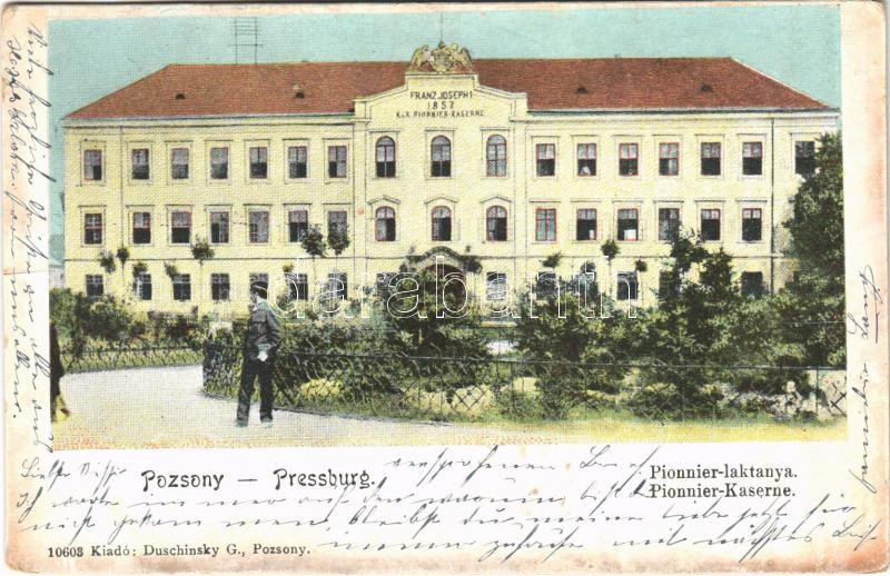 1902 Pozsony, Pressburg, Bratislava; Pionnier laktanya. Duschinsky G. 10603. / Franz Joseph I K.u.K. Pionnier Kaserne / military barracks (szakadás / tear)