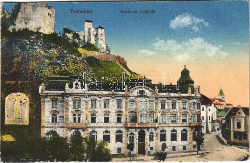 Trencsén, Trencín; Erzsébet szálloda, vár. Vasúti levelezőlapárusítás ... https://www.darabanth.com/de/396-Fernauktion/396.0/Ansichtskarten/Slowakei~1500006/Trencsen-Trencin-Erzsebet-szalloda-var-Vasuti-levelezolaparusitas-31-sz-1917-ho~II2340569
