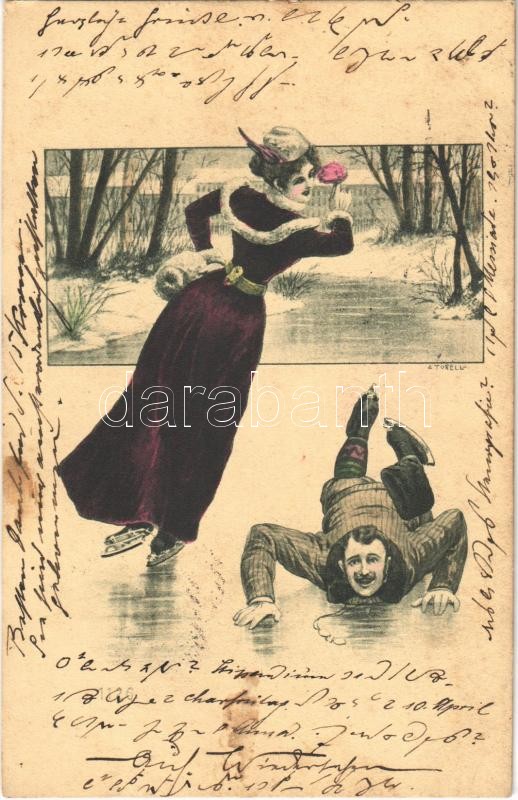 1904 Romantic couple, ice skate, humour, winter sport. Art Nouveau s: ... https://www.darabanth.com/de/396-Fernauktion/396.0/Ansichtskarten/Sport~1500101/1904-Romantic-couple-ice-skate-humour-winter-sport-Art-Nouveau-s-A-Torello~II2407836