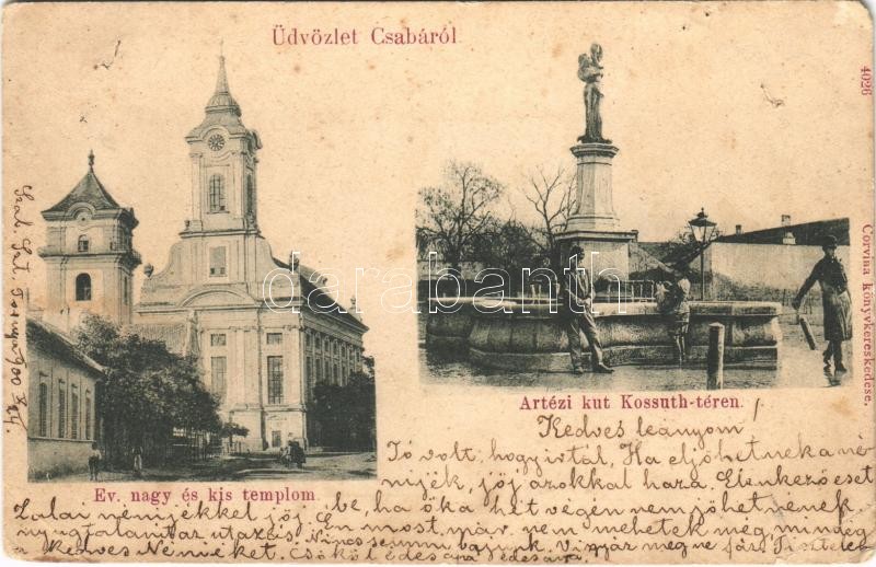 1900 Békéscsaba, Csaba; Evangélikus nagy és kis templom, Artézi kút a ... https://www.darabanth.com/de/396-Fernauktion/396.0/Ansichtskarten/Ungarn~1500004/1900-Bekescsaba-Csaba-Evangelikus-nagy-es-kis-templom-Artezi-kut-a-Kossuth-teren-EK~II2408788