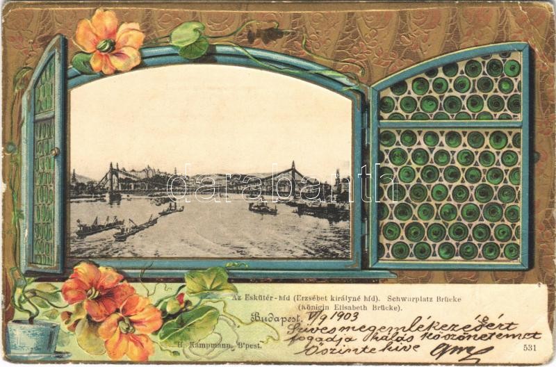 1903 Budapest, Az Eskütér-híd (Erzsébet királyné híd). H. Kampmann dom... https://www.darabanth.com/de/396-Fernauktion/396.0/Ansichtskarten/Ungarn~1500004/1903-Budapest-Az-Eskuter-hid-Erzsebet-kiralyne-hid-H-Kampmann-dombornyomott-Art-Nouveau-~II2391560