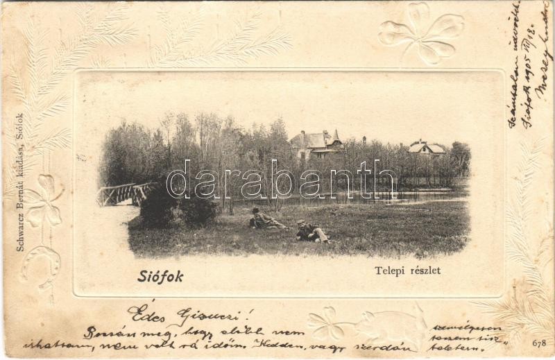 1905 Siófok, Telepi részlet. Schwarcz Bernát kiadása. Art Nouveau, Emb... https://www.darabanth.com/de/396-Fernauktion/396.0/Ansichtskarten/Ungarn~1500004/1905-Siofok-Telepi-reszlet-Schwarcz-Bernat-kiadasa-Art-Nouveau-Emb-floral-keret-fl~II2408688