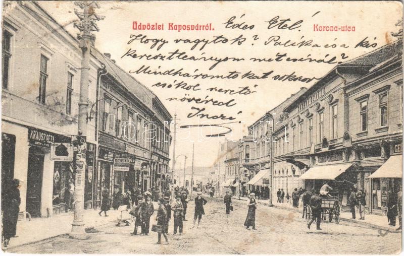 1908 Kaposvár, Korona utca és szálló, Krausz Géza üzlete (EK) https://www.darabanth.com/de/396-Fernauktion/396.0/Ansichtskarten/Ungarn~1500004/1908-Kaposvar-Korona-utca-es-szallo-Krausz-Geza-uzlete-EK~II2409416