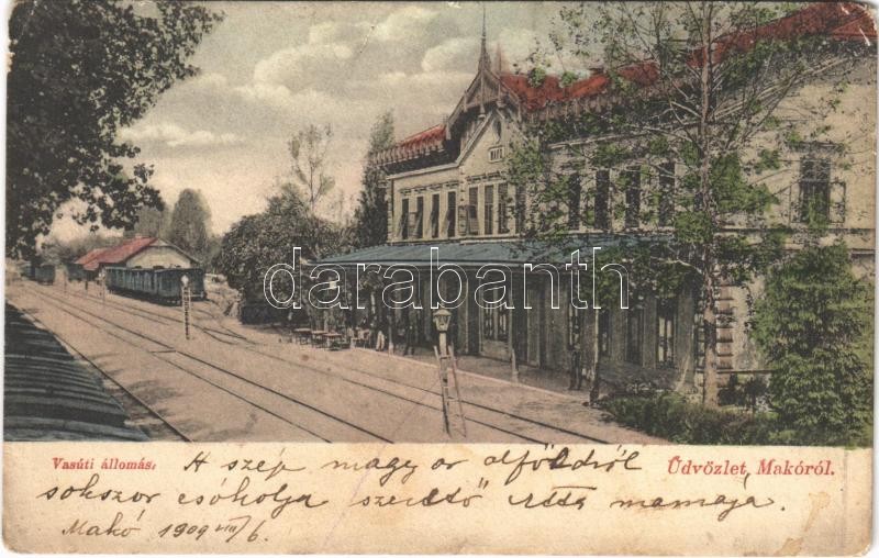 1909 Makó, vasútállomás, vagonok. Kovács Antal kiadása (EK) https://www.darabanth.com/de/396-Fernauktion/396.0/Ansichtskarten/Ungarn~1500004/1909-Mako-vasutallomas-vagonok-Kovacs-Antal-kiadasa-EK~II2409223