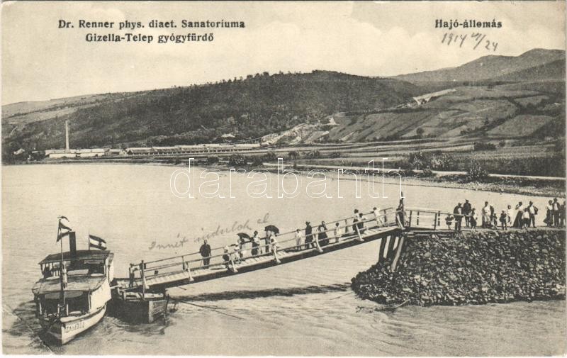 Beschreibung: 1914 Visegrád, Gizella-telep gyógyfürdő, Dr. Renner phys. diaet. szanatóriuma, hajóállomás, Izabella gőzhajó (EK)