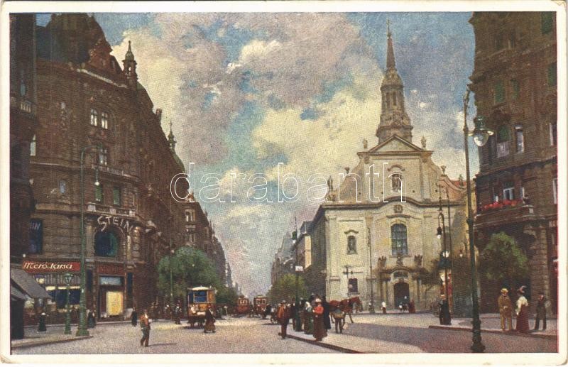 Beschreibung: 1917 Budapest V. Ferenciek tere, templom, villamos, Stein, Mérő és Társa üzlete. Művészlevelezőlap Hausner H. 7014/24.