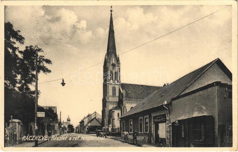 1937 Ráckeve, utca, református templom, üzletek, kerékpár, automobil. ... https://www.darabanth.com/de/396-Fernauktion/396.0/Ansichtskarten/Ungarn~1500004/1937-Rackeve-utca-reformatus-templom-uzletek-kerekpar-automobil-Kenessey-Gyorgy-kiadasa~II2409601