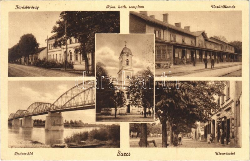 Beschreibung: 1940 Barcs, Járásbíróság, vasútállomás, Dráva híd, utca, római katolikus templom