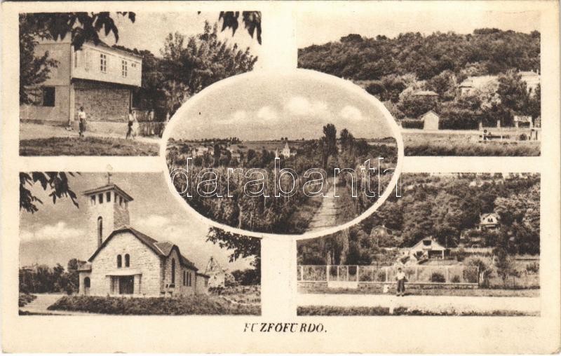 Beschreibung: Balatonfűzfő, Fűzfőfürdő; Táj, strand, vízimentő csónak, Országút, Római katolikus templom, látkép