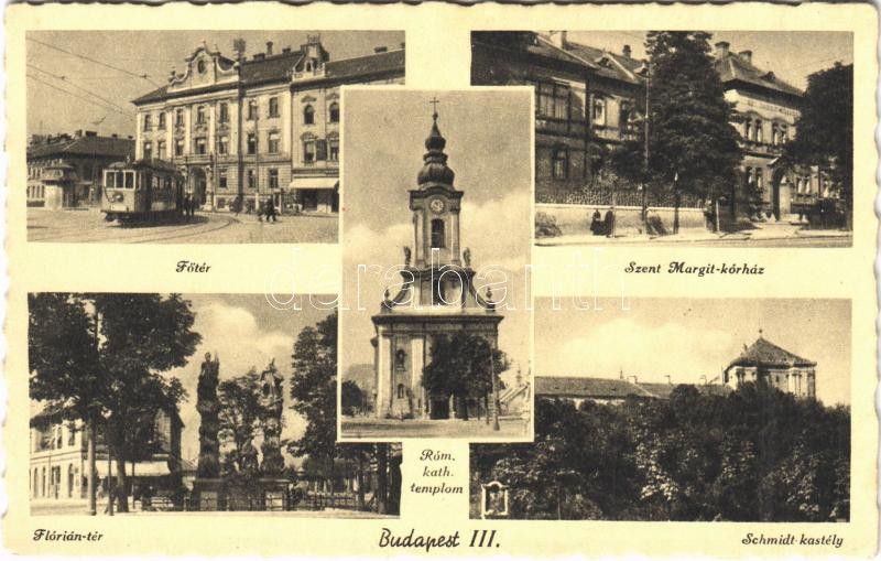 Budapest III. Óbuda, Fő tér, villamos, Szent Margit kórház, Flórián té... https://www.darabanth.com/de/396-Fernauktion/396.0/Ansichtskarten/Ungarn~1500004/Budapest-III-Obuda-Fo-ter-villamos-Szent-Margit-korhaz-Florian-ter-Schmidt-kastely-R~II2409927