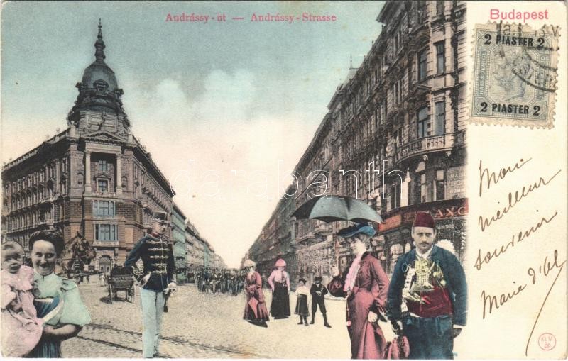 Budapest VI. Andrássy út. Montázs hölgyekkel, huszárral és török áruss... https://www.darabanth.com/de/396-Fernauktion/396.0/Ansichtskarten/Ungarn~1500004/Budapest-VI-Andrassy-ut-Montazs-holgyekkel-huszarral-es-torok-arussal-TCV-card~II2301966