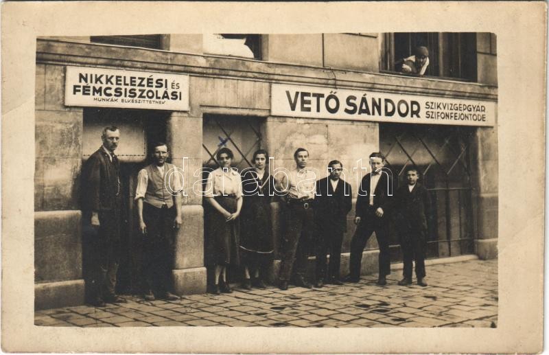Budapest VII. Vető Sándor Szikvízgépgyár szifonfejöntöde, Nikkelezési és fémcsiszolási munkák elkészíttetnek, munkások. Péterfy Sándor utca 17., photo (EB)