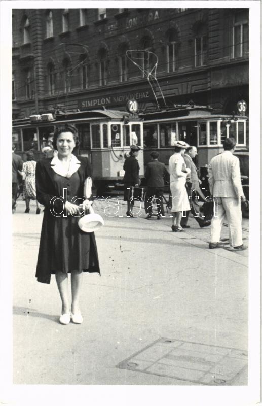 Beschreibung: Budapest VIII. Blaha Lujza tér, Simplon Nagy Kávéház, hölgy, 36-os és 20-as villamos. photo