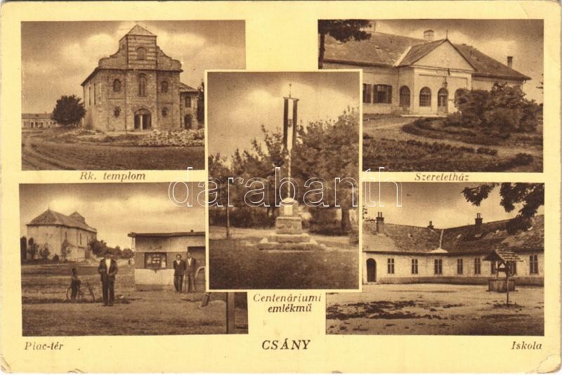 Csány (Heves), Római katolikus templom, iskola, Szeretetház, piac tér,... https://www.darabanth.com/de/396-Fernauktion/396.0/Ansichtskarten/Ungarn~1500004/Csany-Heves-Romai-katolikus-templom-iskola-Szeretethaz-piac-ter-Centenariumi-emlekmu-o~II2404765