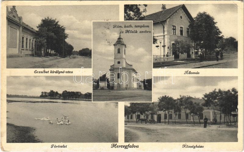 Beschreibung: Hercegfalva (Mezőfalva), vasútállomás, tó, községháza, Erzsébet királyné utca, Római katolikus templom, Hősök szobra