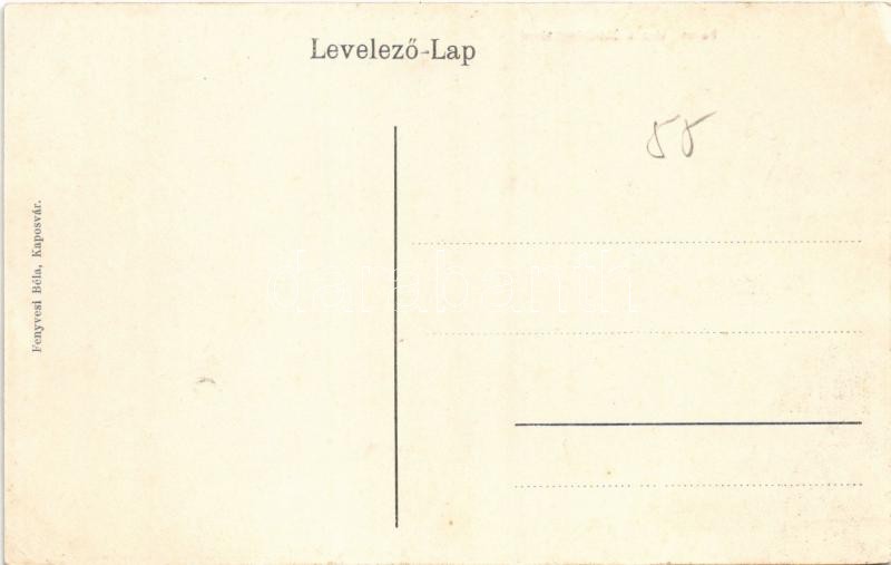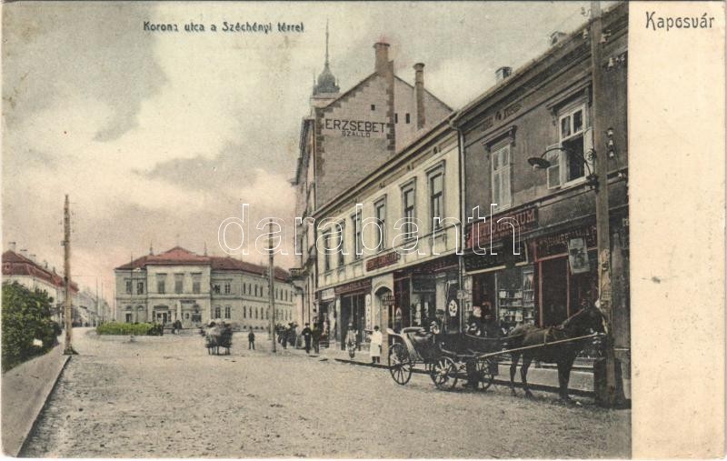 Kaposvár, Korona utca, Széchenyi tér, Erzsébet szálloda, Antikvárium, Steinitz Ignác és Fia, Pollák József, Szabó Lipót, Lusztig üzlete. Fenyvesi Béla kiadása (enyhén ázott sarkak / slightly wet corners)