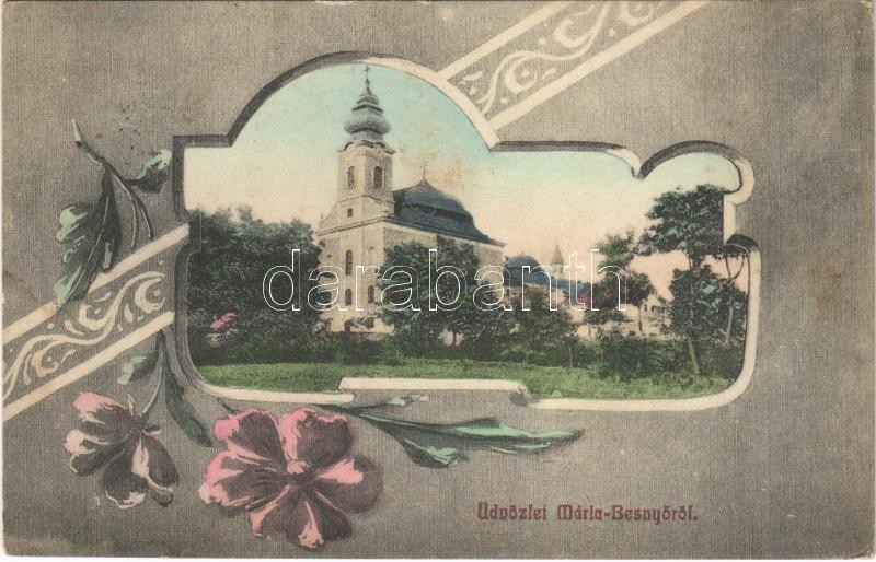 Beschreibung: Máriabesnyő (Gödöllő), kegytemplom. Montázs virággal, Art Nouveau