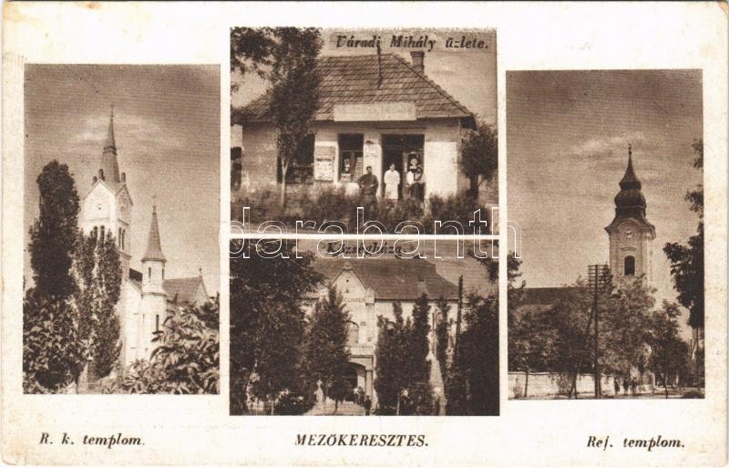 Beschreibung: Mezőkeresztes, Római katolikus templom, Községháza, Református templom, Váradi Mihály üzlete és saját kiadása (fl)