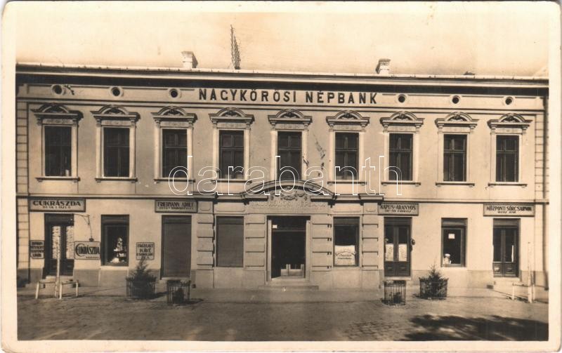 Nagykőrös, Népbank, Deák László cukrászda, Friedmann Adolf játék és rövidáru üzlet, Kapus és Aranyos női és férfi fodrász, Weisz Jenő Központi sörcsarnoka. Photo Pécsi (Rb)